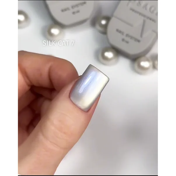 Lakier hybrydowy Silk Cat można nakładać dwiema warstwami, ale nawet jedna zapewnia pełne krycie. Olśniewający połysk z subtelnym, wielokolorowym połyskiem utrzymuje się przez cały okres noszenia.