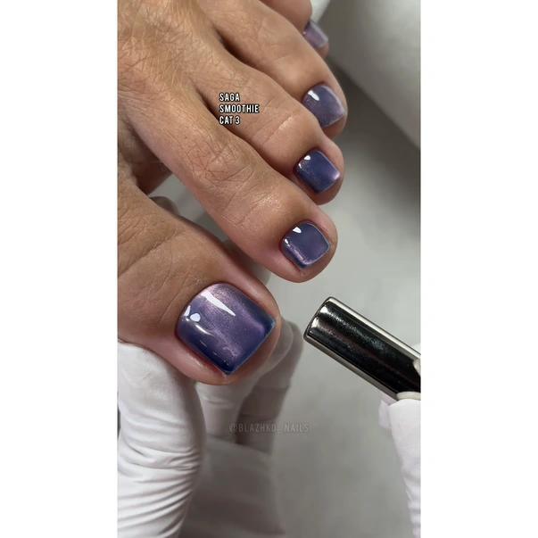 Lakier żelowy Saga Cat Eye w odcieniu niebiesko-fioletowym o średniej gęstości. Dzięki średniej konsystencji Smoothie Cat jest łatwy w aplikacji: równomiernie się rozprowadza, nie spływa i nie spływa pod skórki. Wykończenie utrzymuje połysk i intensywność koloru przez cały manicure lub pedicure.
